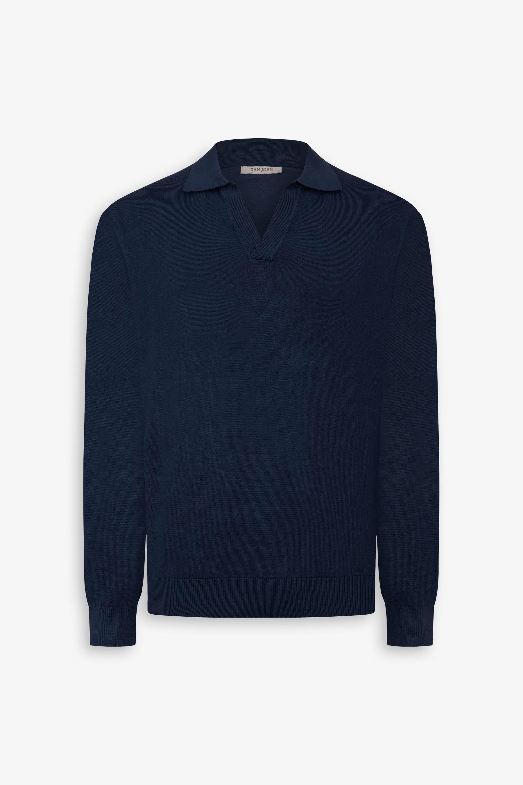Solid color knitted polo shirt in viscose. Open collar and long sleeves.