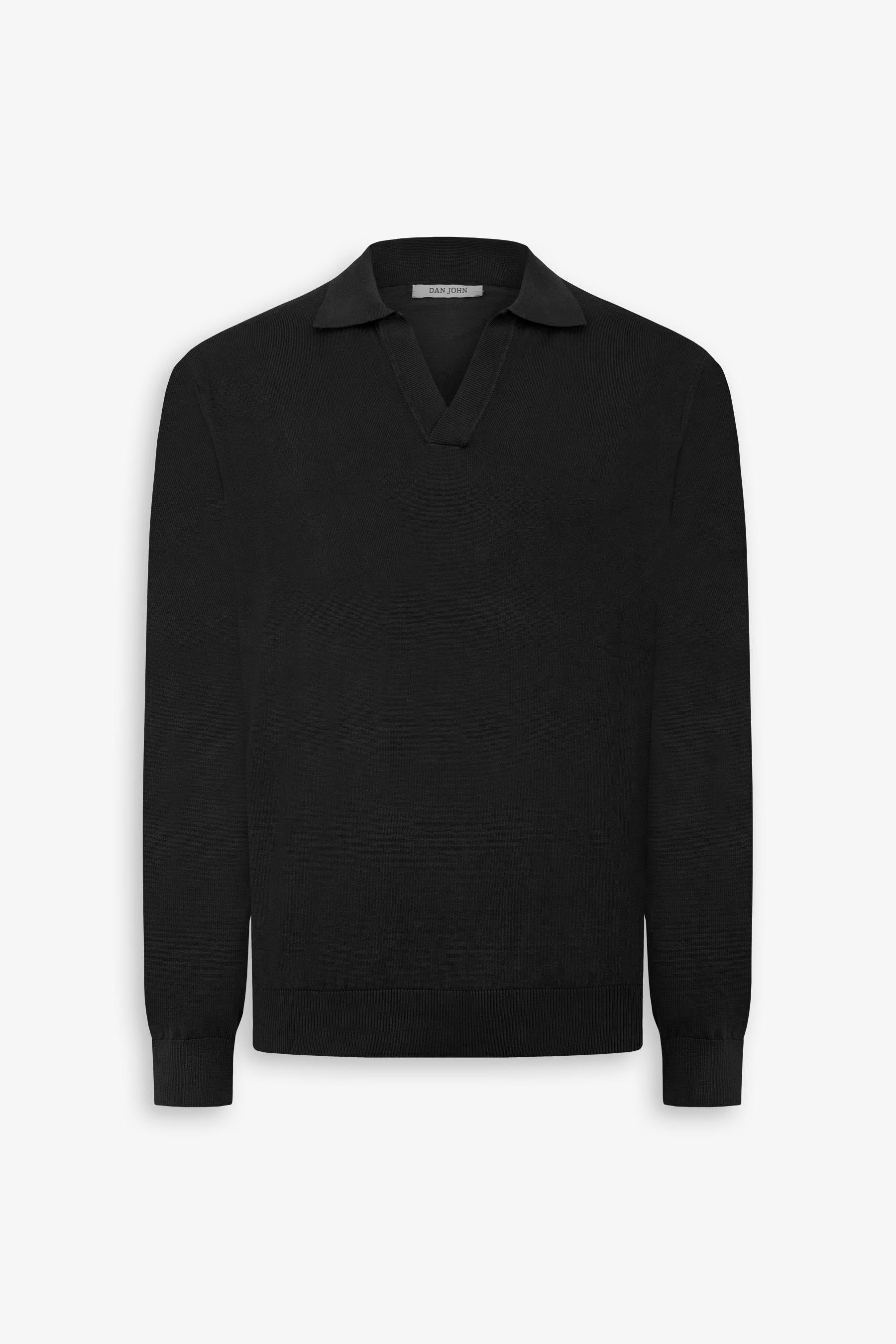 Solid color knitted polo shirt in viscose. Open collar and long sleeves.