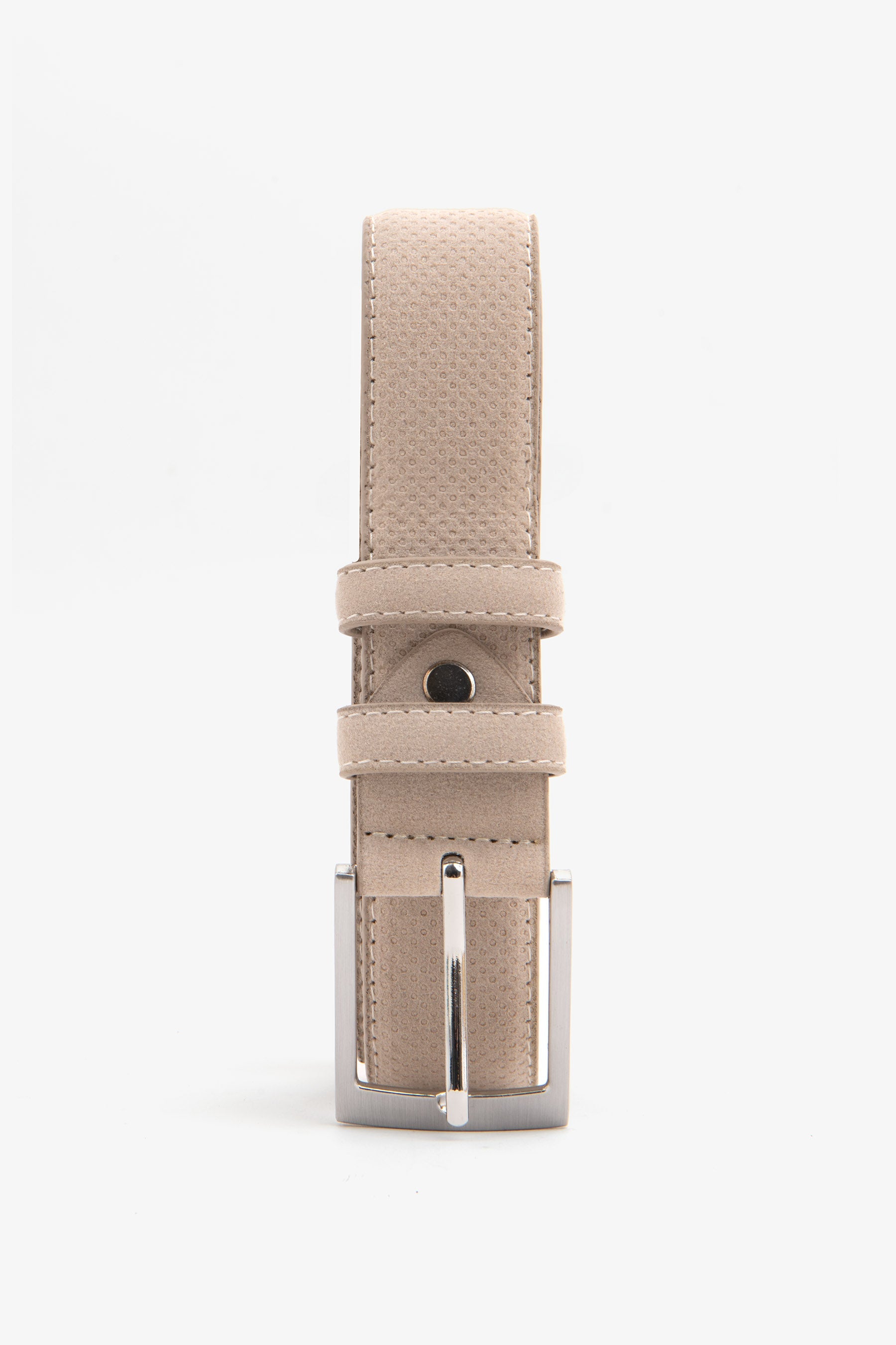Perforated eco-leather belt. Square metal buckle.