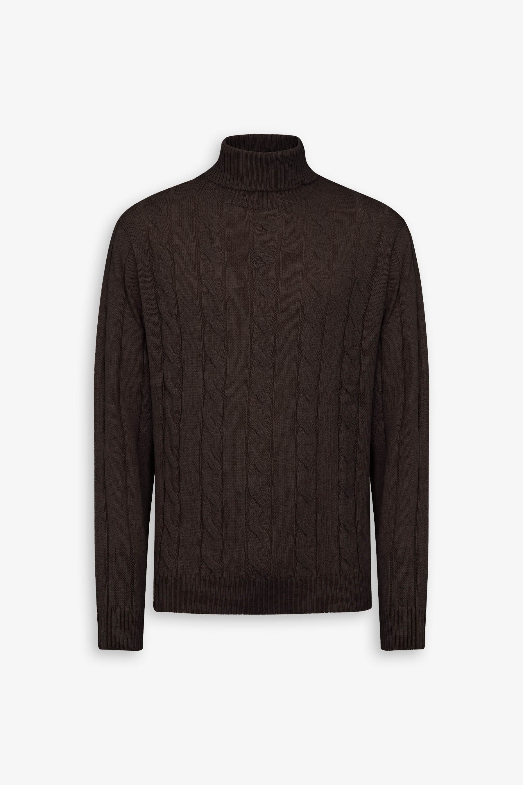 High neck sweater with cable knit and flat rib. Long sleeves.