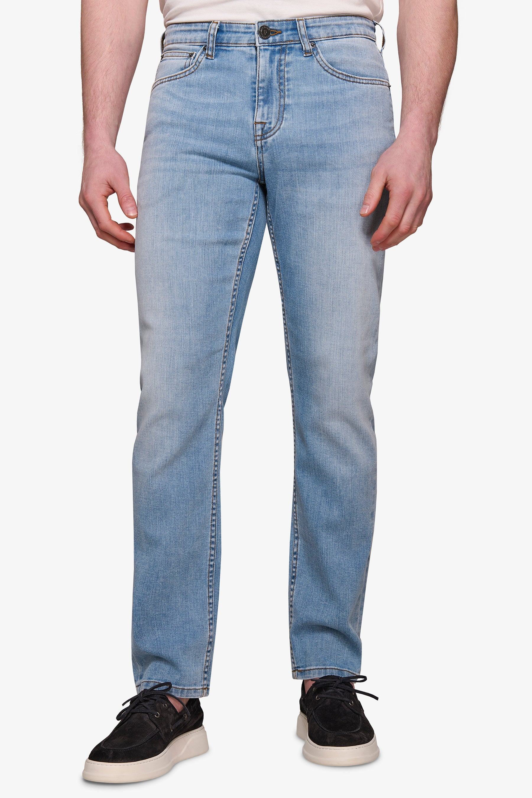 5-pocket denim trousers in stretch cotton. Waistband and yoke with 2-needle stitching.