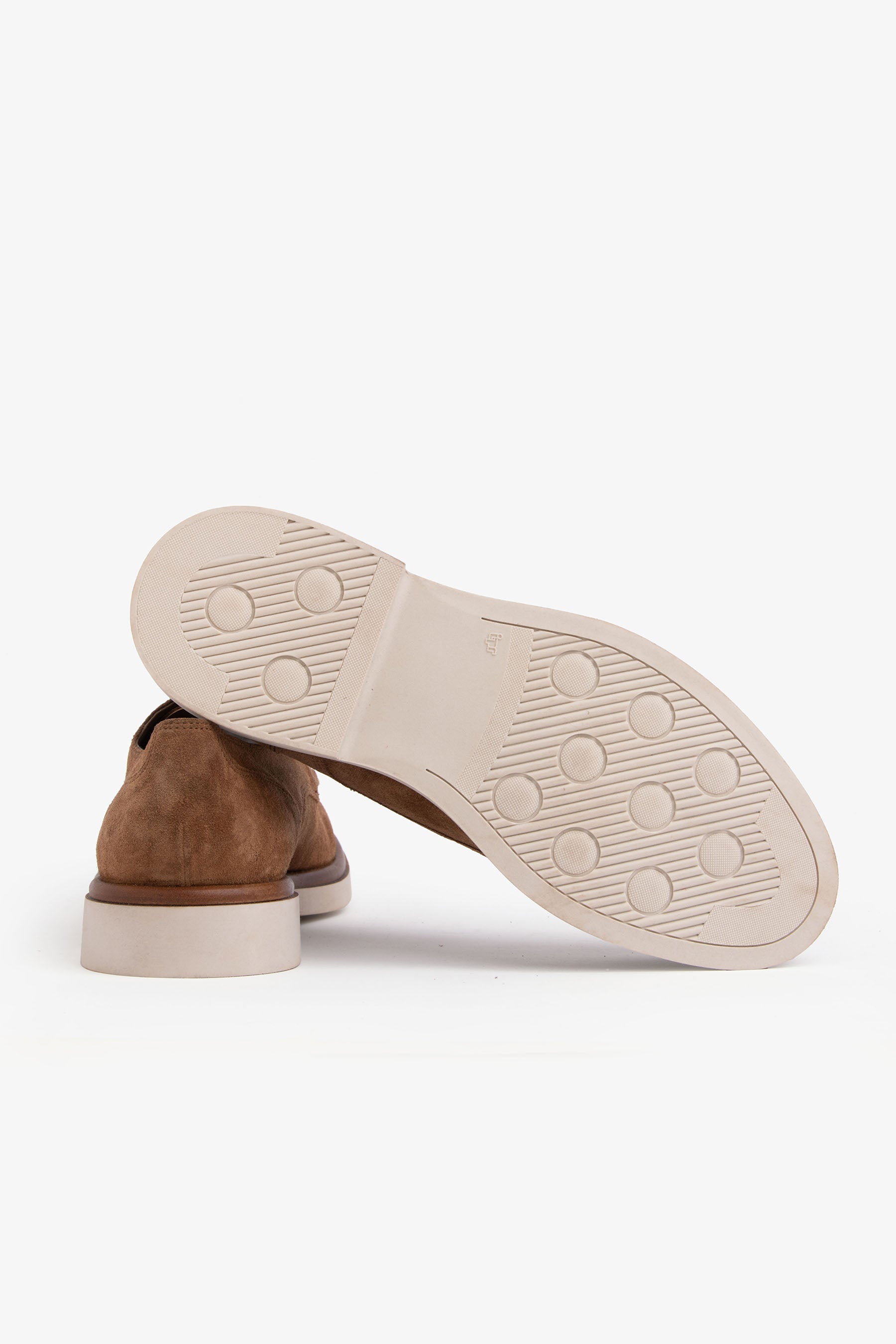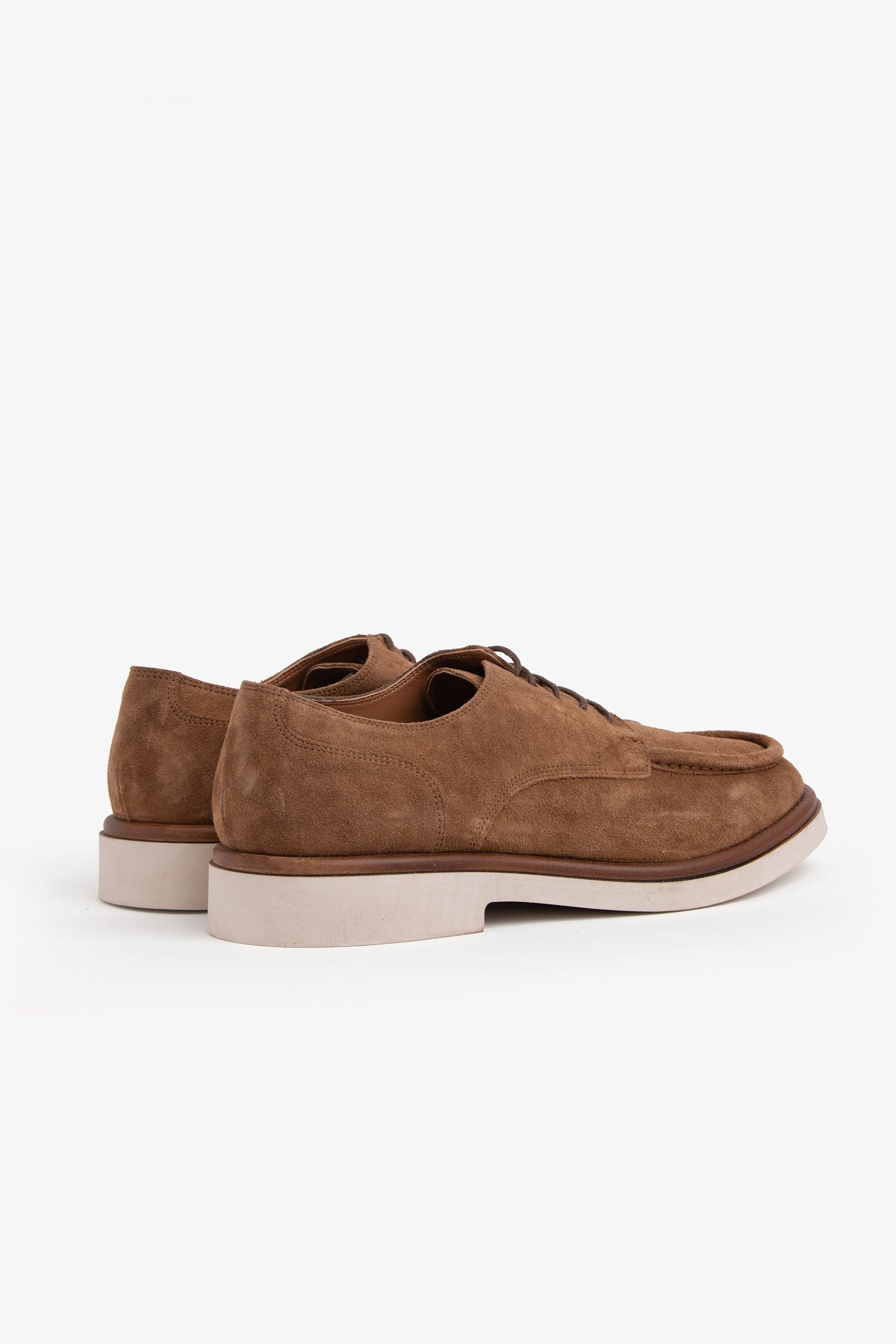 Derby with 100% suede pan. Contrast rubber sole and matching welt.