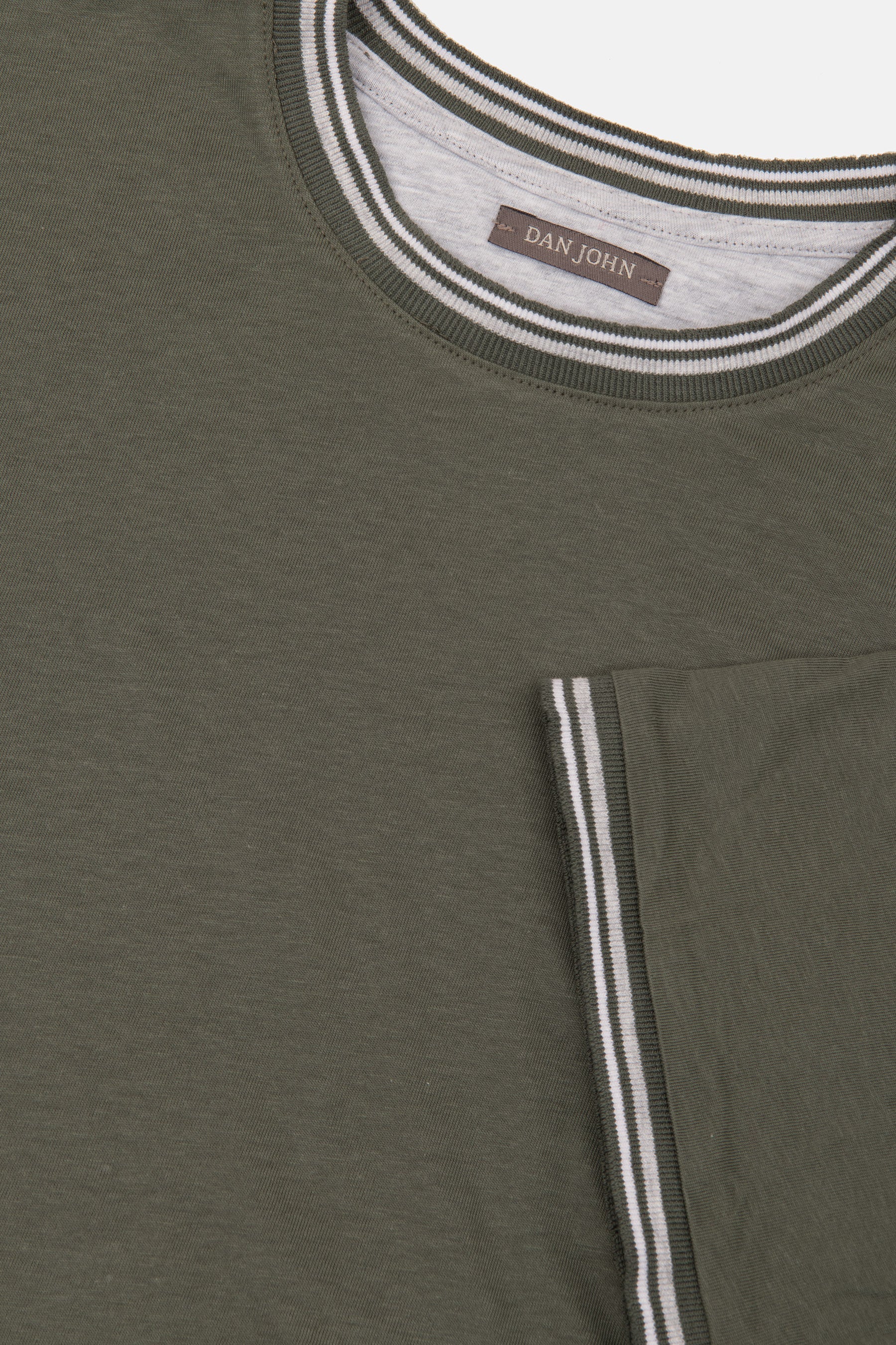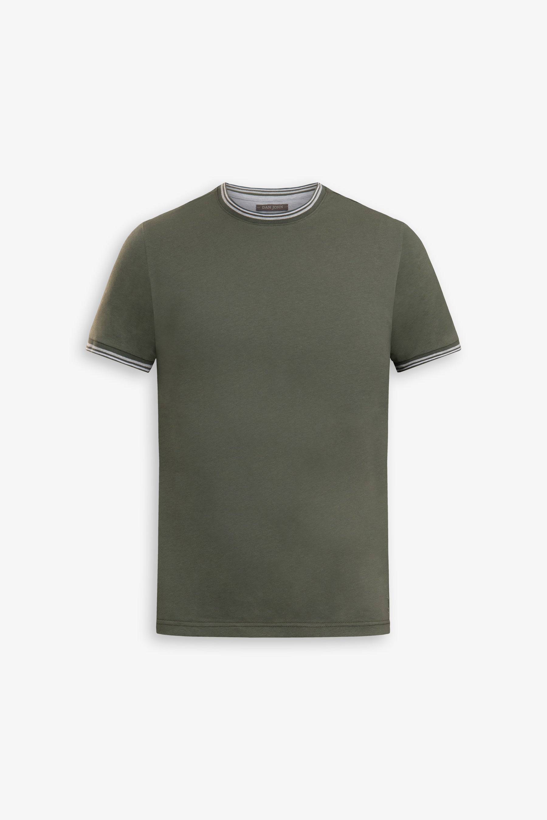 Solid color crew-neck T-shirt in jersey, with contrasting profiles. Short sleeves.