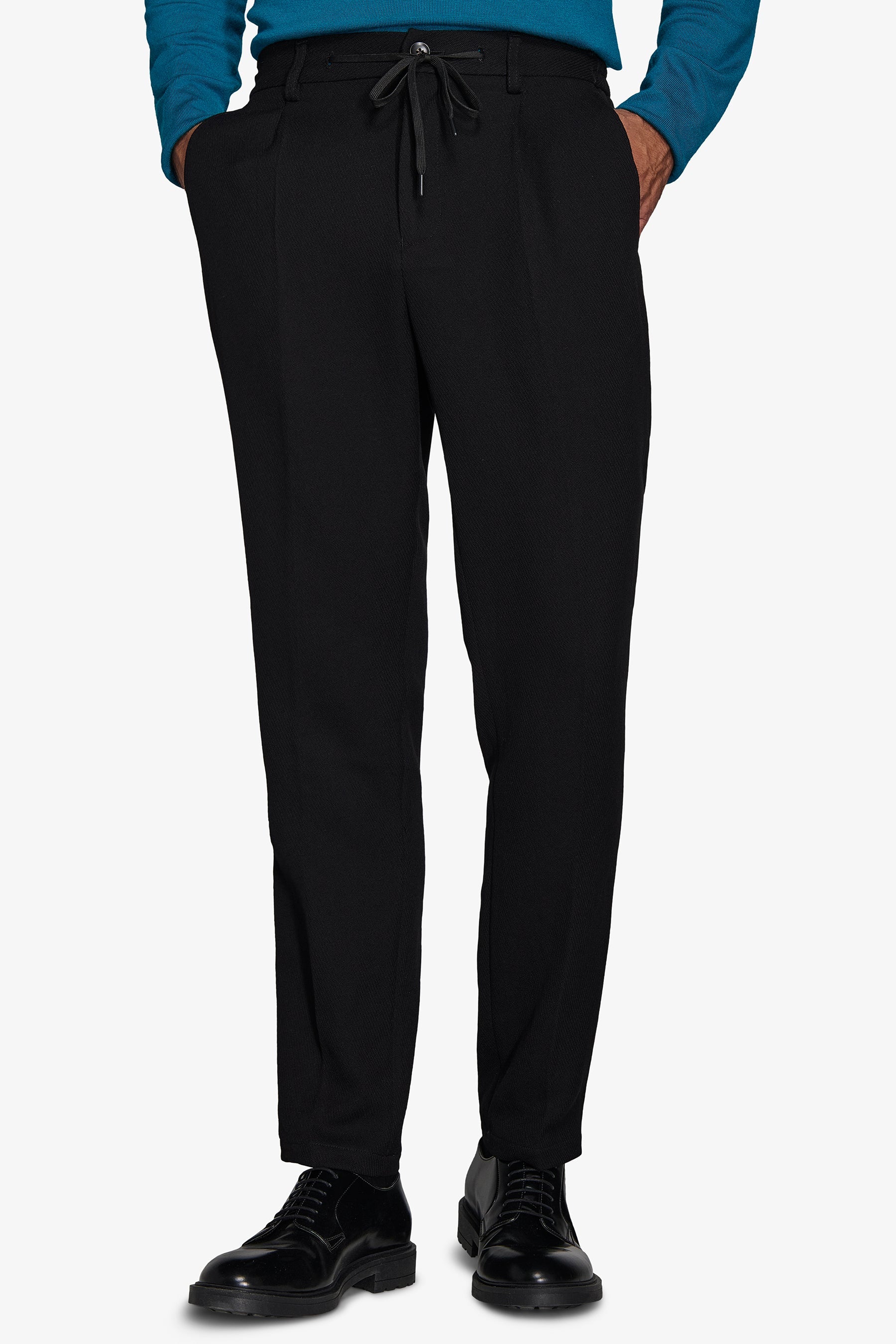 Trousers with drawstring in diagonal textured fabric. Comfort line with slant pockets. Trousers with pleats.