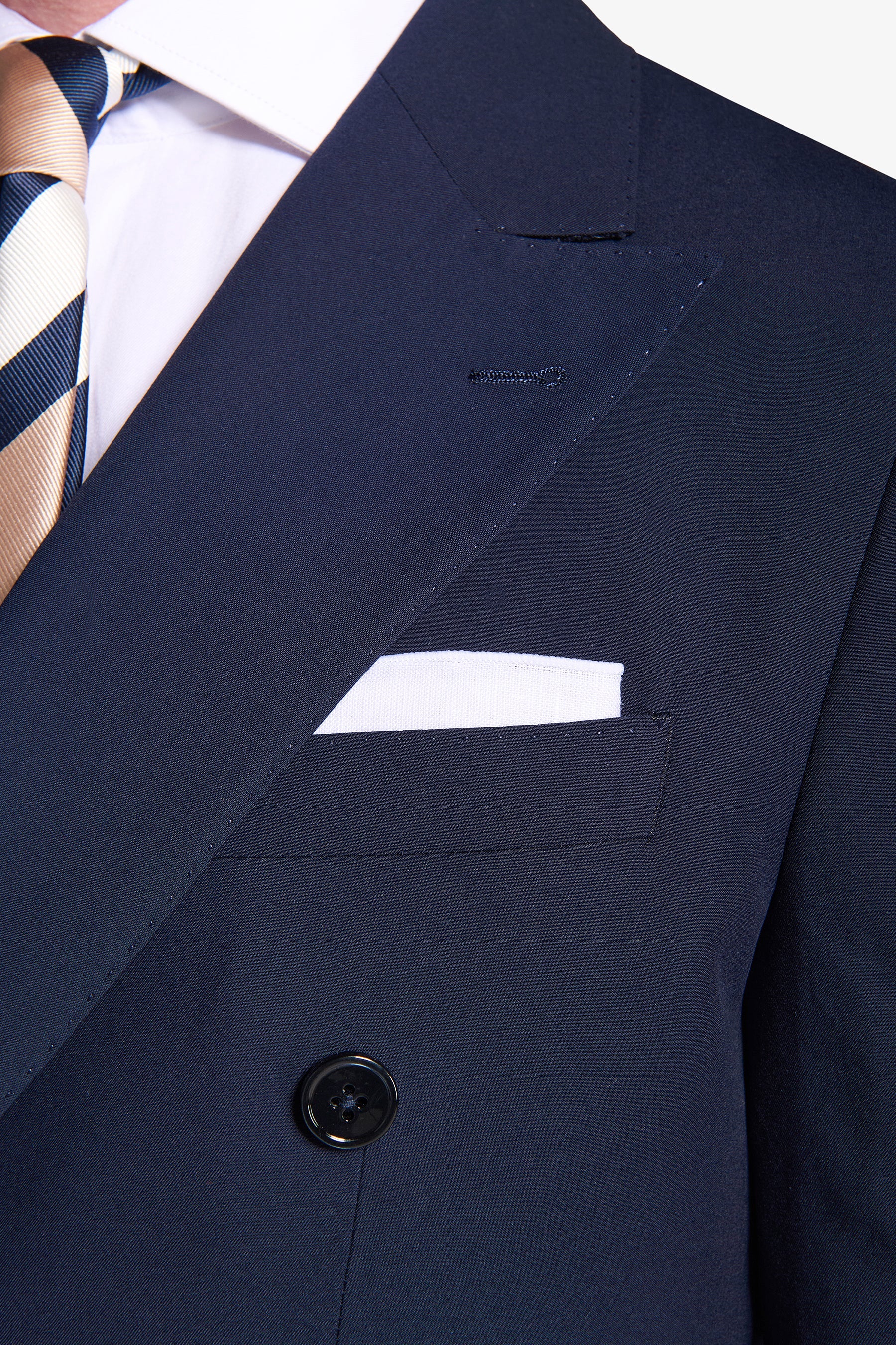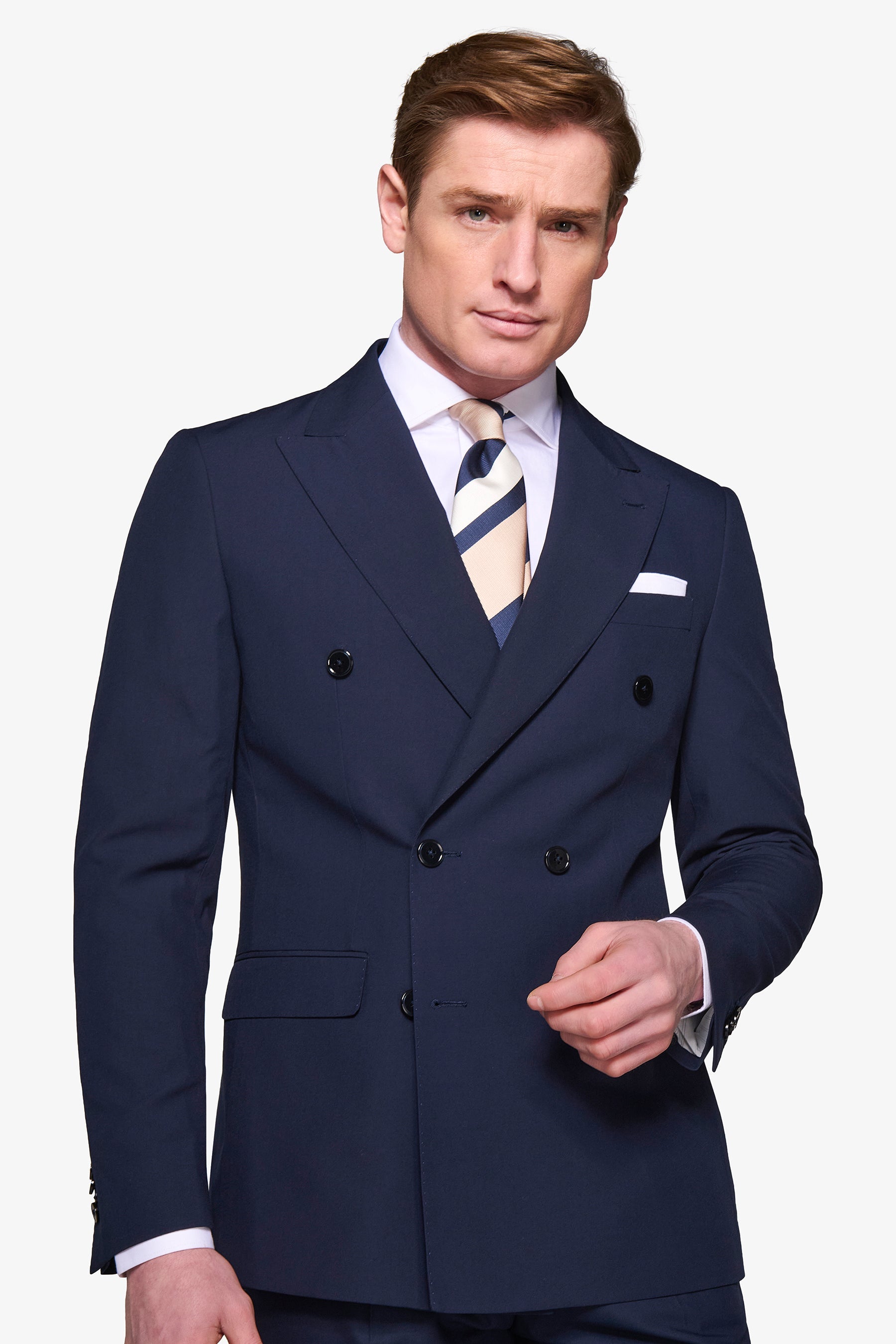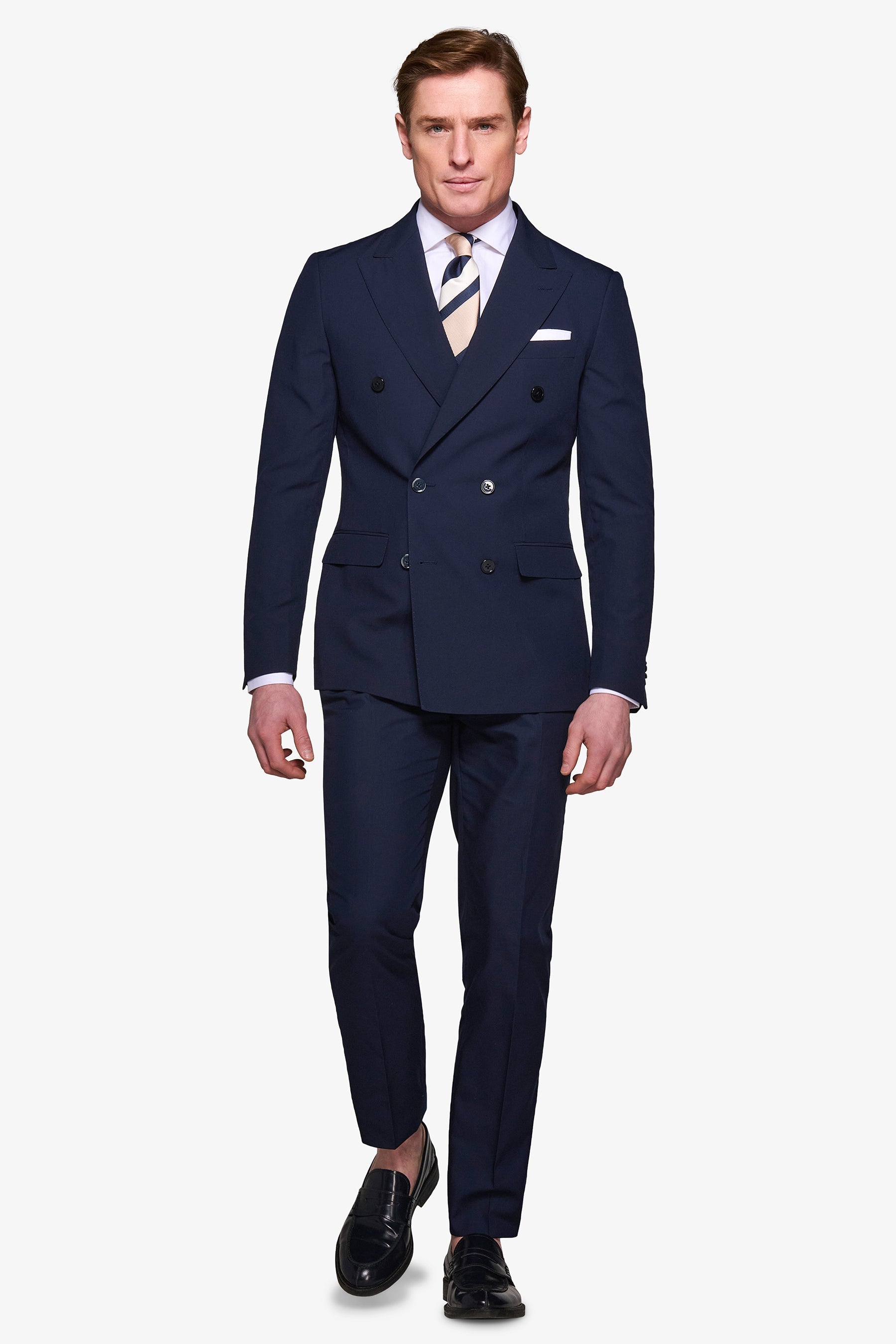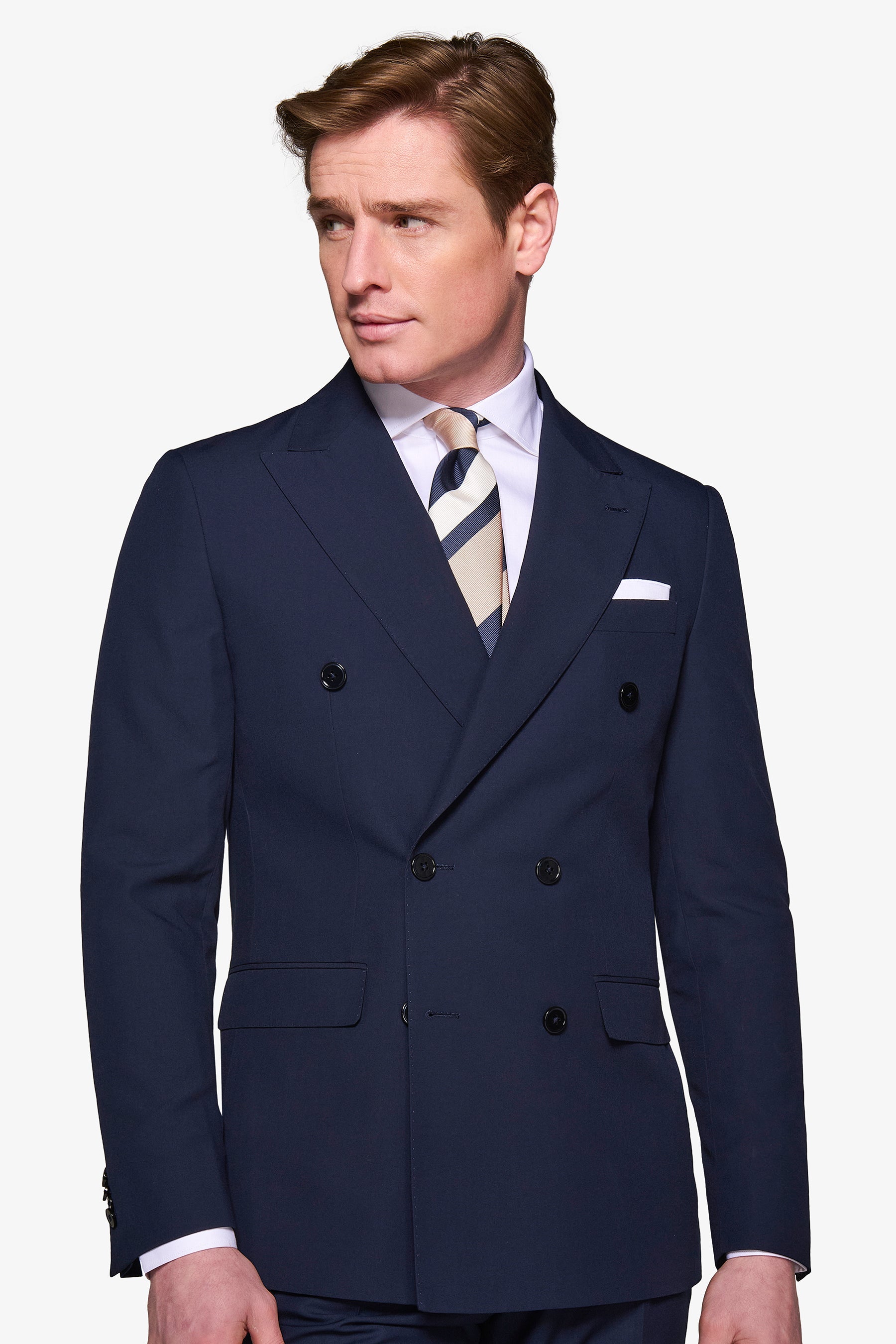 Solid color double-breasted suit jacket in poly viscose fabric. Slim line with flap pockets. Lined.