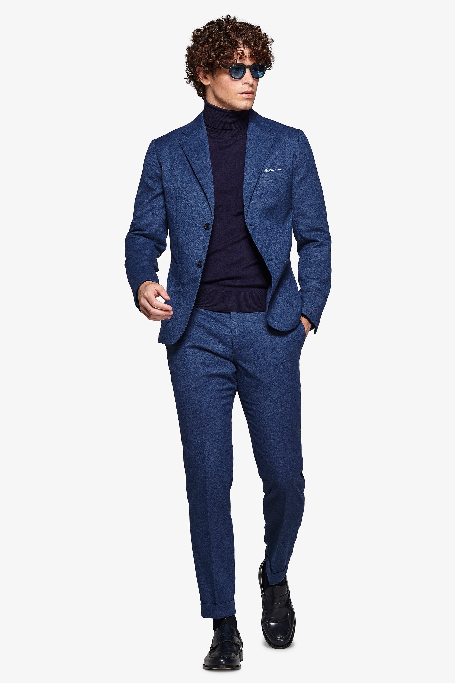 Melange flannel suit jacket. Slim line with normal lapel. Two buttons and flap pockets.