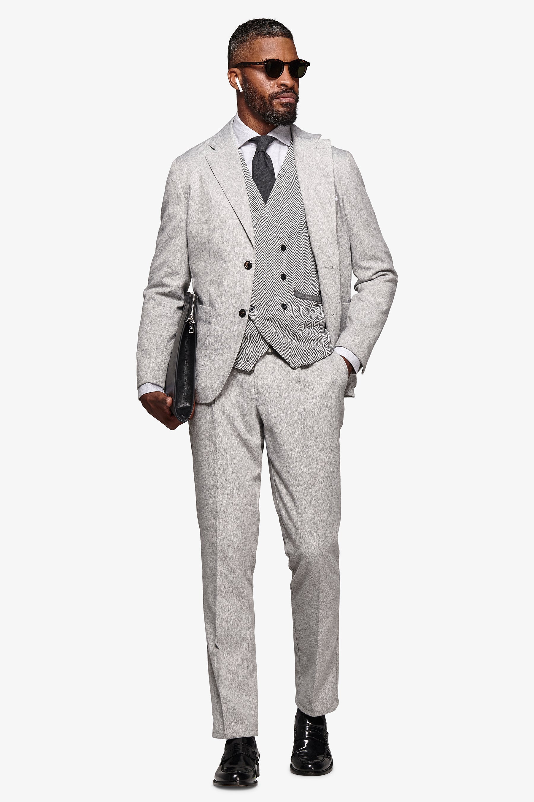 Melange flannel suit jacket. Slim line with normal lapel. Two buttons and flap pockets.