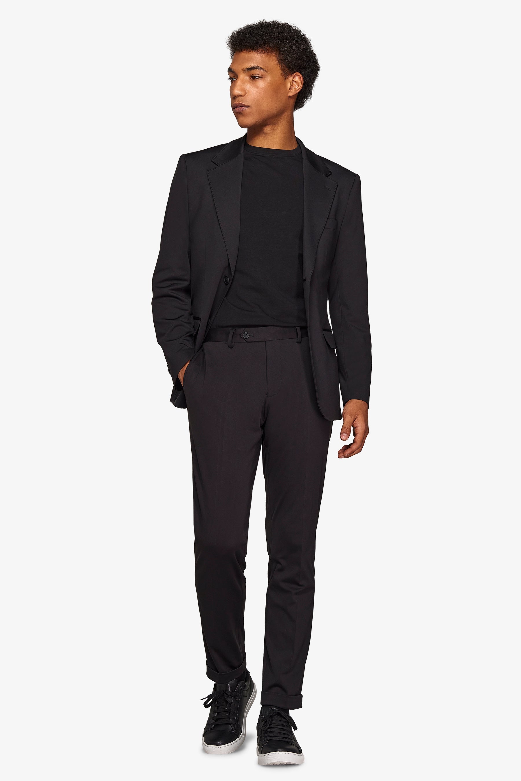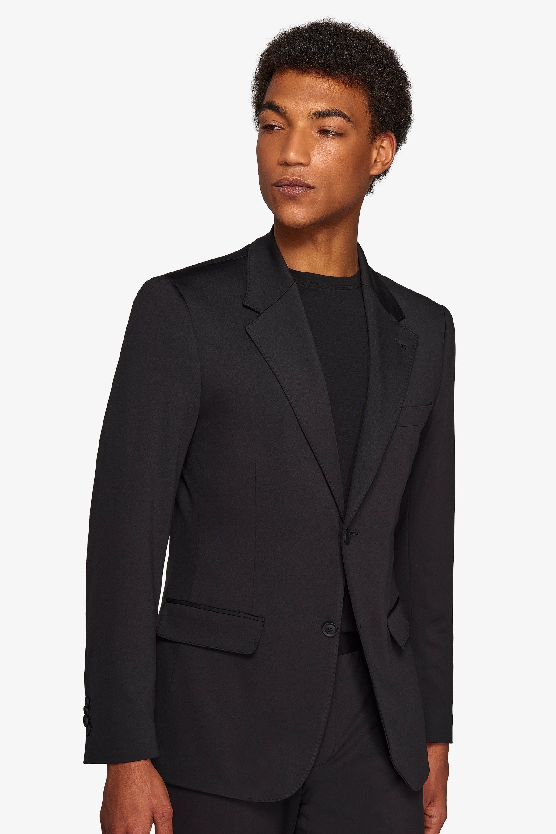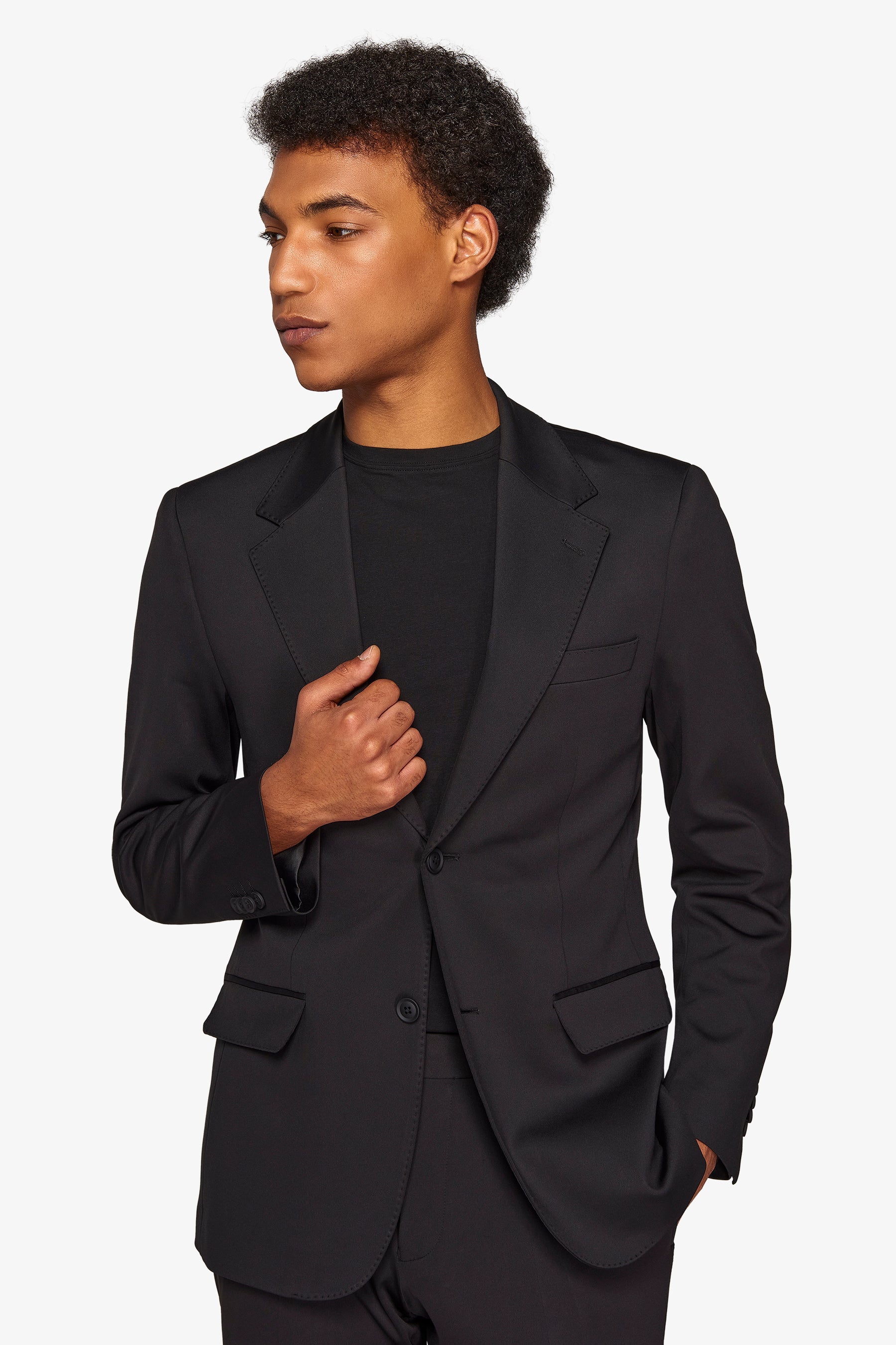 Suit jacket in stretch jersey stretch fabric. Slim line with normal lapel. Two buttons and flap pockets. Lined. Side slits.