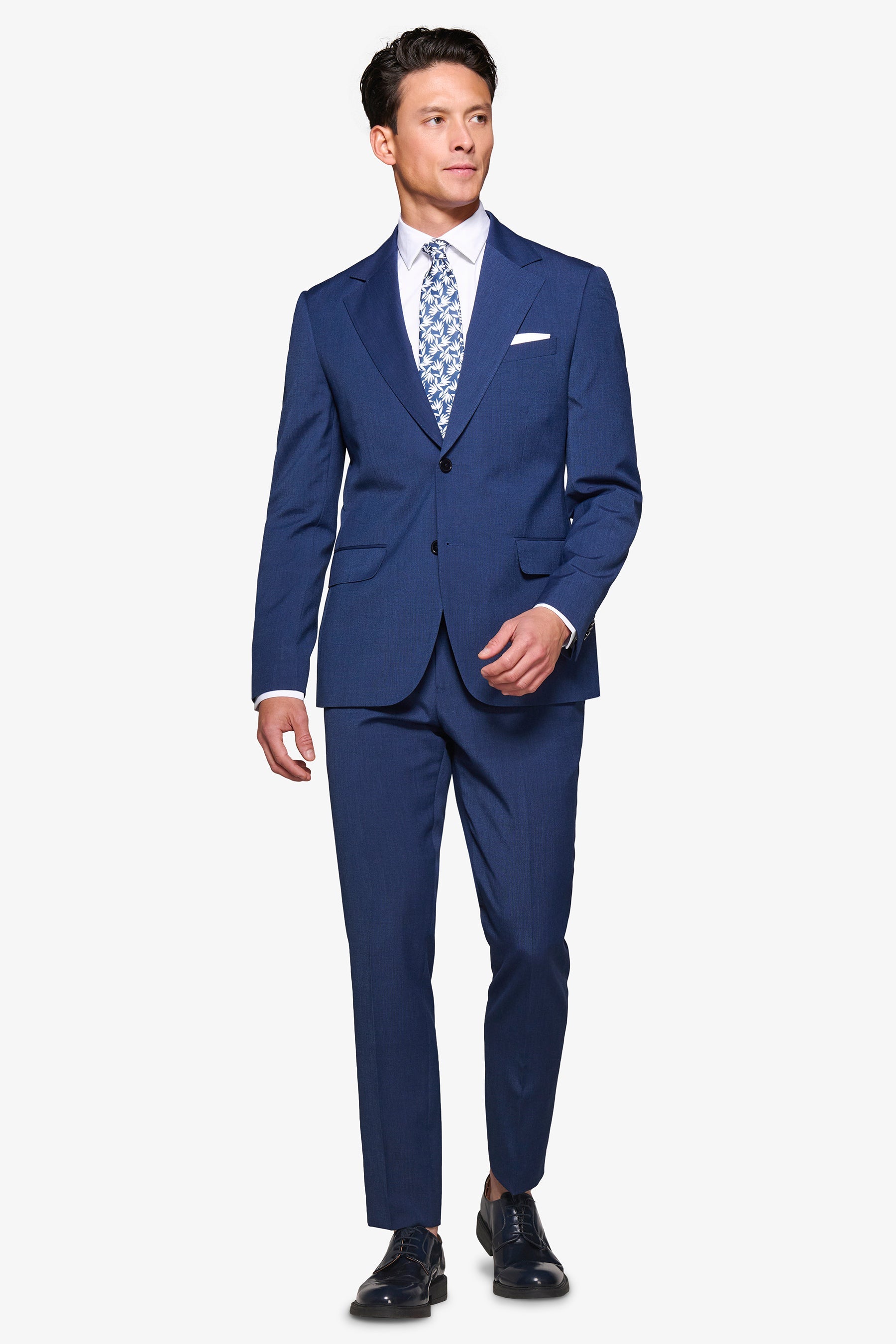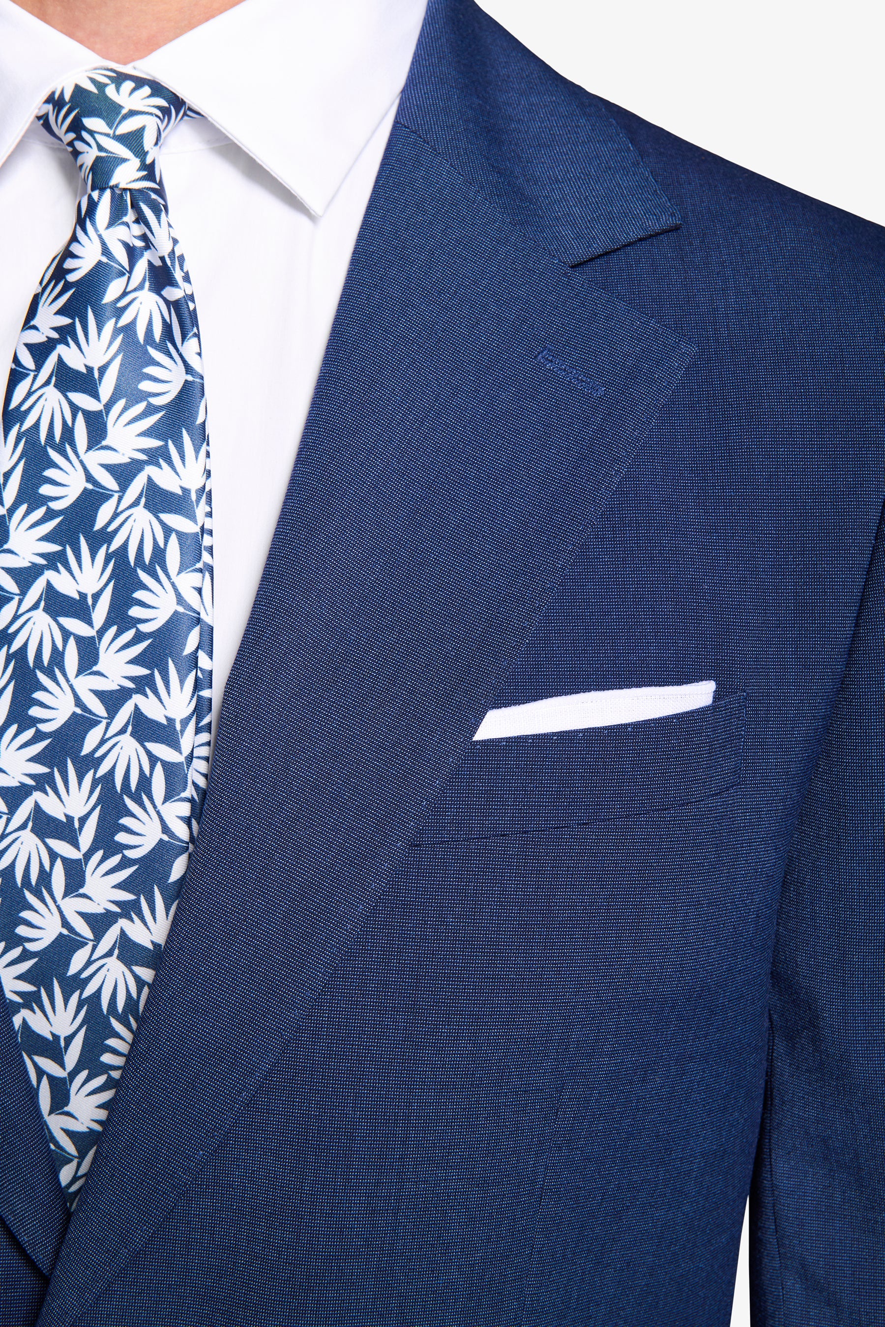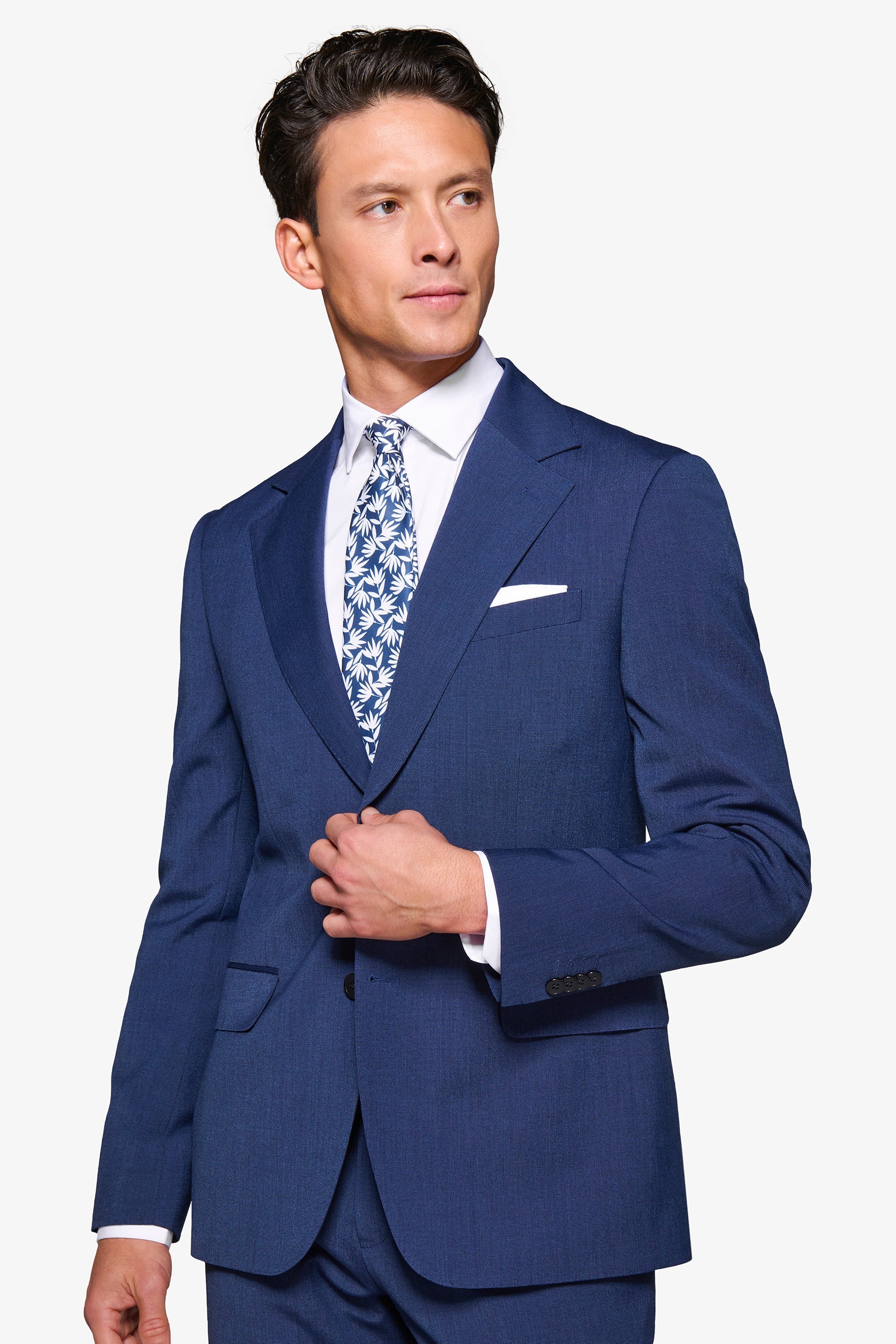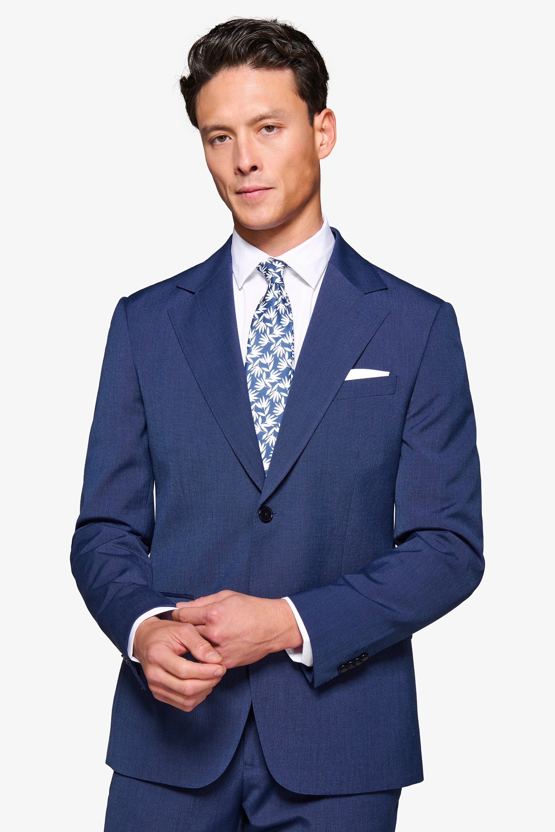 Pinpoint weave suit jacket in poly viscose fabric. Slim line with wide lapels. Two buttons and flap pockets. Lined. Side slits.