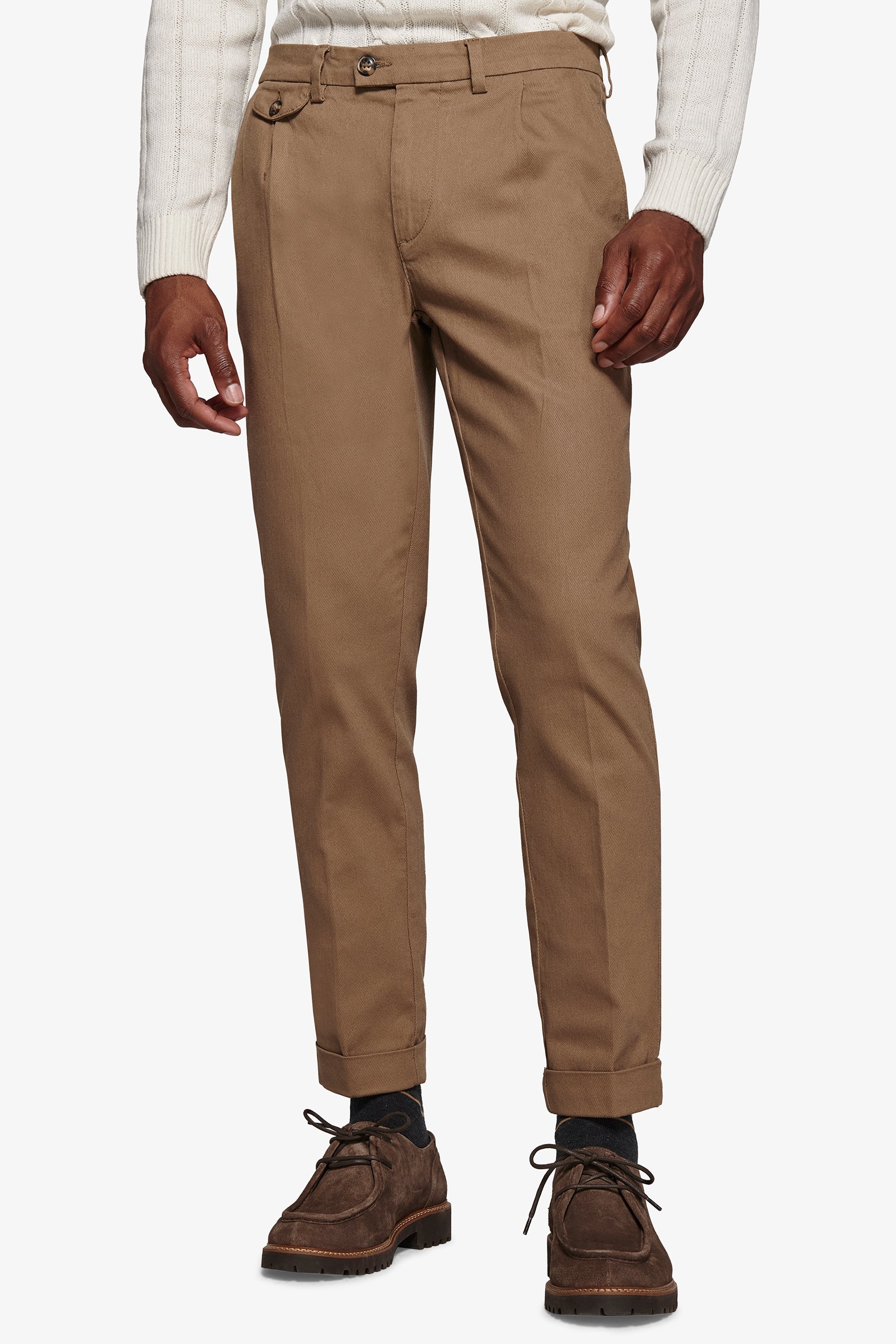 Cavalry stretch cotton trousers. Slim line with slant pockets. Trousers with pleats. Watch pocket with flap and button. Turn-up at the bottom.