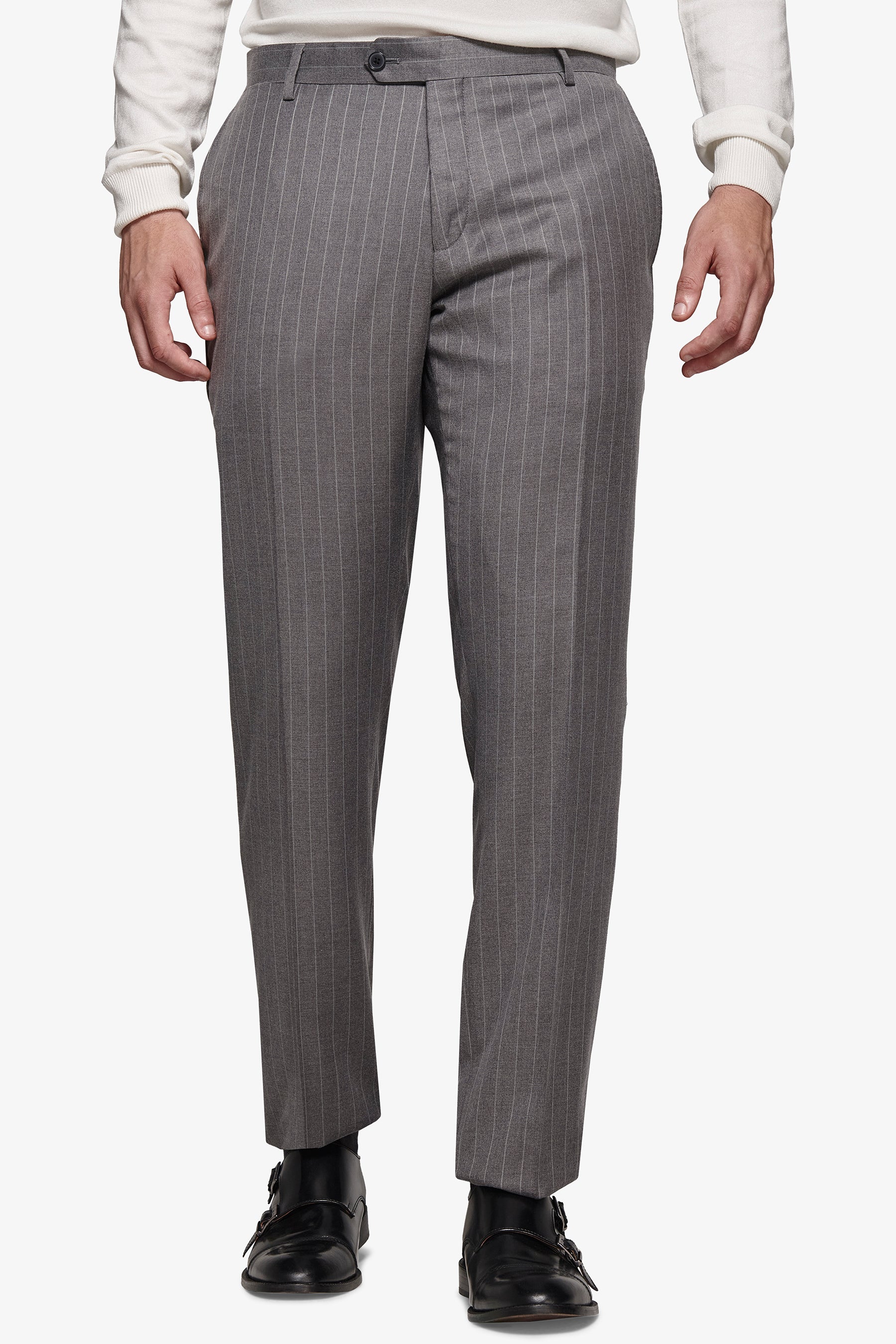 Regular slim pinstripe patterned suit trousers in poly viscose fabric. Regular slim line with slant pockets. Flat front.
