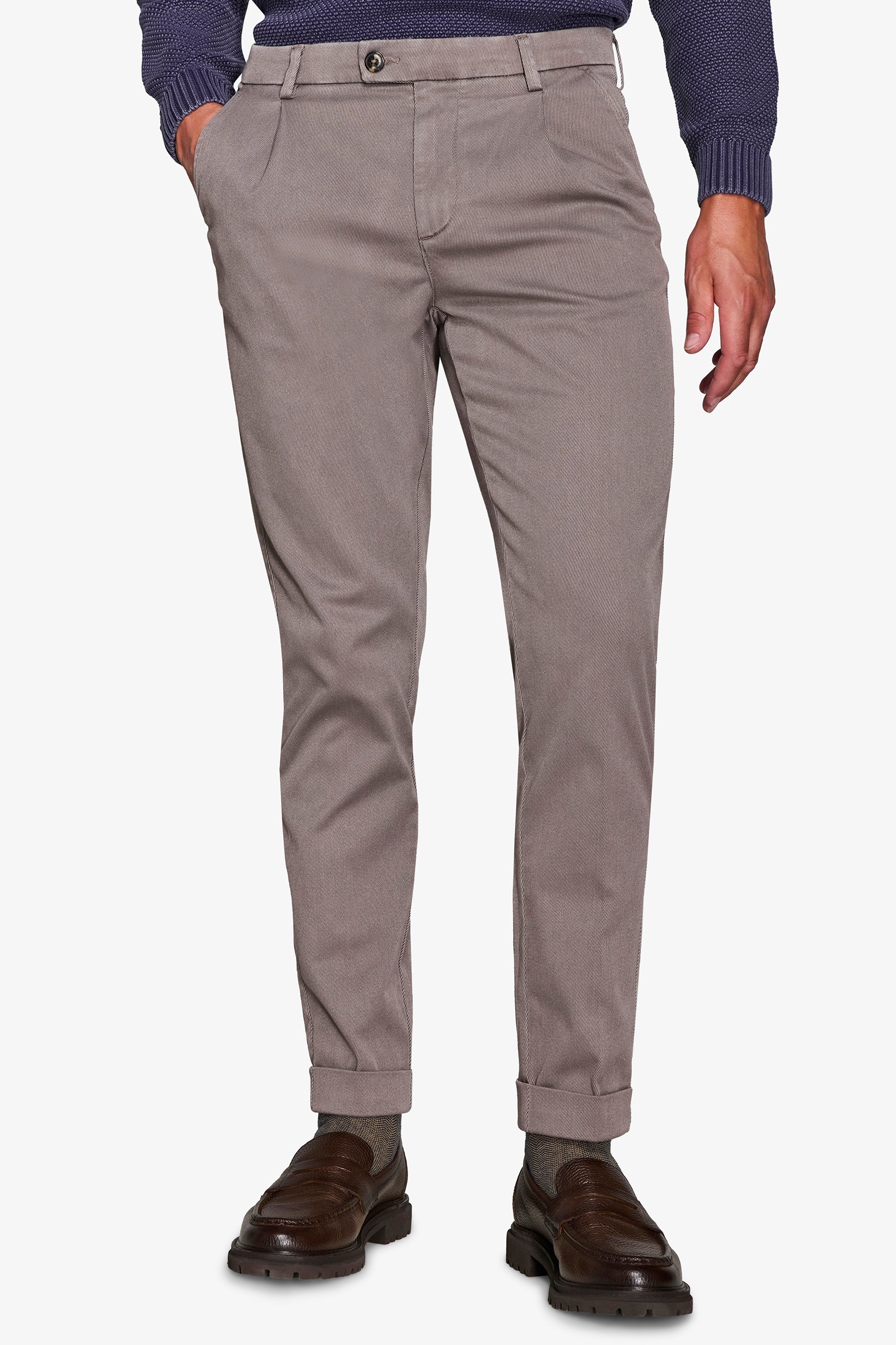 Trousers in cavalry garment dyed fabric. Slim line with slanted pockets. Trousers with pleats. Double welt rear pockets.